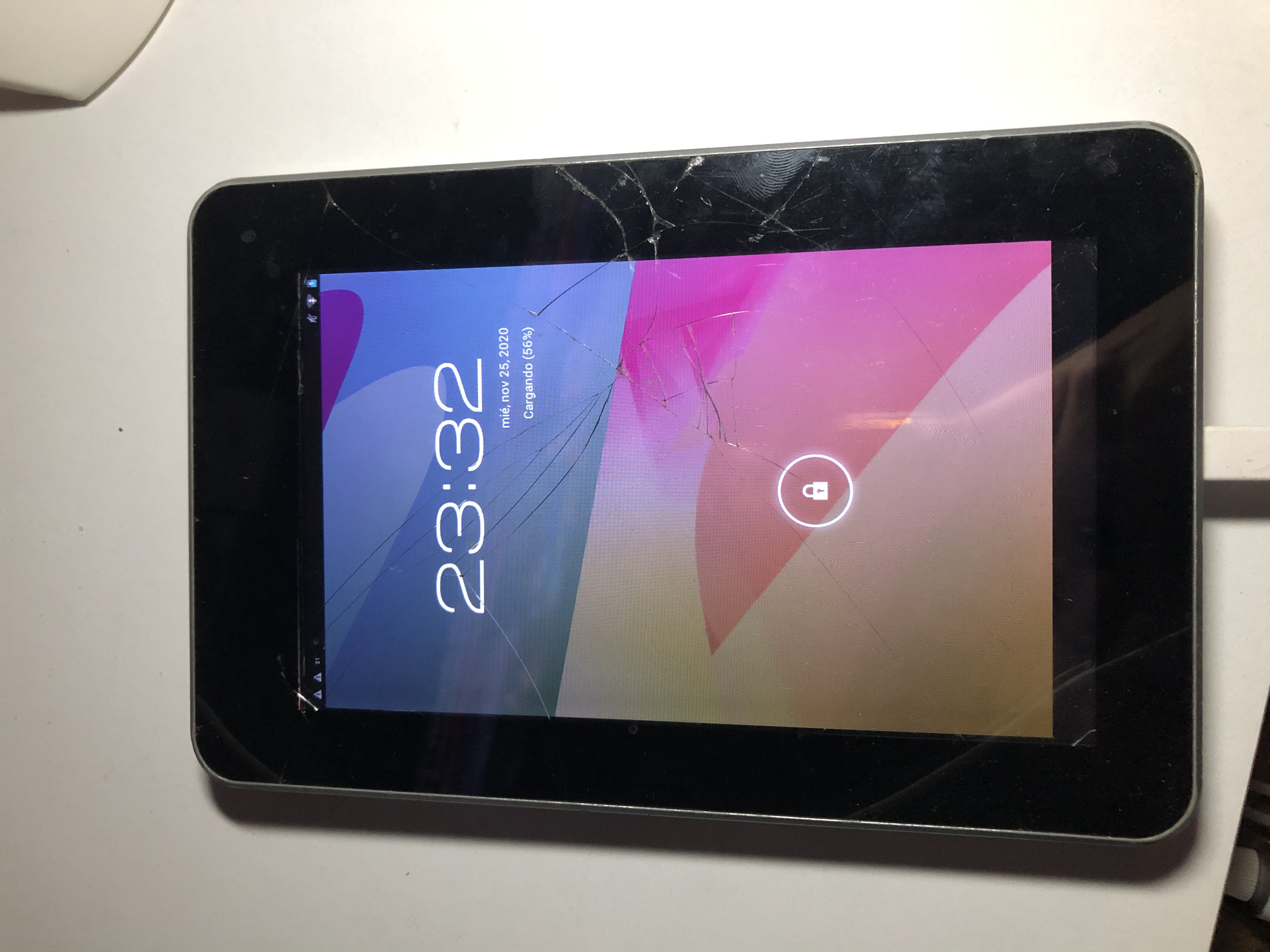 Tablet de segunda generación, 5gb de memoria expansible con tarjeta SD. Anda impecable, tiene astillada la pantalla pero no le afecta en absoluto